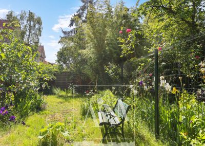 La terrasse est une véritable bouffée d'air frais avec sa vue plongeante sur le jardin arrière de 140 m2, verdoyant, source de luminosité et de calme (sensation campagne garantie).