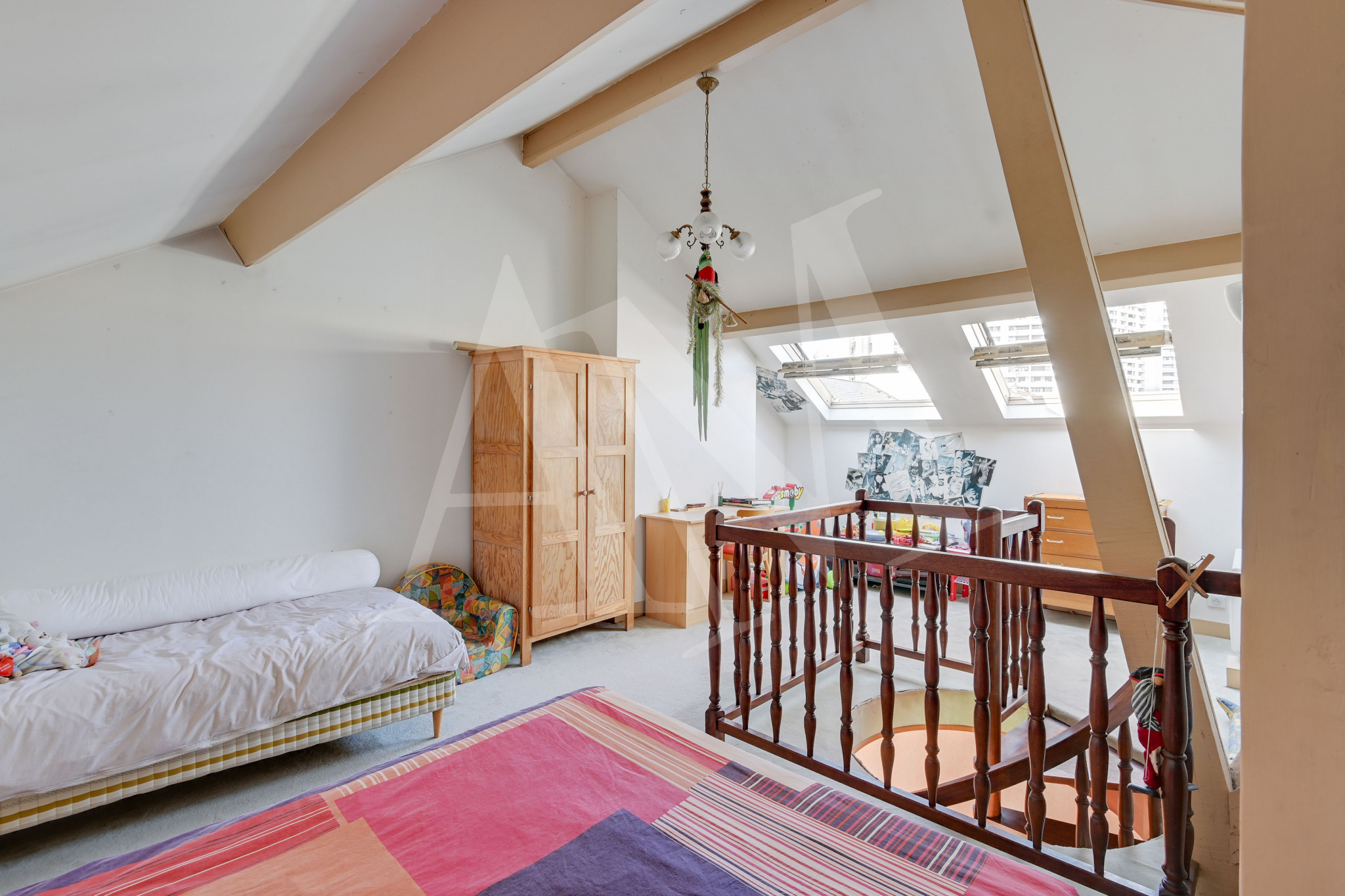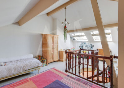 Nous avons également à ce niveau deux chambres (12 et 10,5 m²), une salle de douche, des toilettes. Nous empruntons l’escalier en colimaçon pour rejoindre les combles aménagés étant une pièce de plus de 42 m², un grenier.